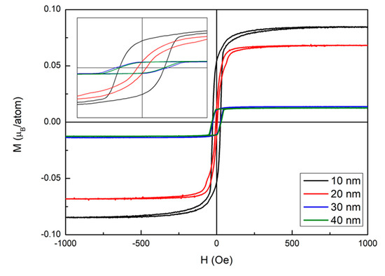 Figure 6 shows the hysteresis loop of the films with an in-plane external field (Hext) for various CoFeVB thicknesses, as determined through AGM. The external field (Hext) was 1000 Oe in the AGM measurement, which was enough to observe the saturated magnetic spin status of the Co40Fe40V10B10 films. While the magnetization for the 10 nm and 20 nm films was very close to each other, the magnetization for the 30 nm and 40 nm was lower. It can be reasonably concluded that the 40 nm film was not homogeneous and was a discontinuous film, inducing weak magnetization. Table 1, which presents the EDX analysis, also indicates that the 40 nm film was not a homogeneous composition. The enlarged illustration of Figure 6 shows that the largest Hc was achieved at 30 nm. The external field (Hext) used had difficulty rotating the spin state, consequently reducing the magnetization and decreasing the χac value. From Figure 6, the results indicate that the in-plane hysteresis loop of the CoFeVB films was an easy axis. Moreover, the hysteresis loops also indicate that the CoFeVB films are magnetically soft.