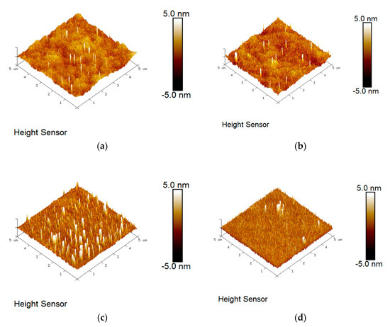 The surface roughness and morphology of the CoFeVB films were investigated by AFM, as shown in Figure 7a–d. When the thickness was increased from 10 nm to 40 nm, the root-mean-square values (Rq) of surface roughness were 0.57 nm, 0.39 nm, 1.07 nm, and 0.69 nm, respectively. The increased surface roughness can lead to the pinning effect of the domain wall, which is not easy to move, resulting in an increase in coercivity and a decrease in the χac value [40,41]. In Figure 4 and Figure 7, the maximum alternate-current magnetic susceptibility and surface roughness had a relation, which indicates that the increased surface roughness can lead to the pinning effect of the domain wall, which has difficulty moving, resulting in the increase in coercivity and the decrease in the χac value.
