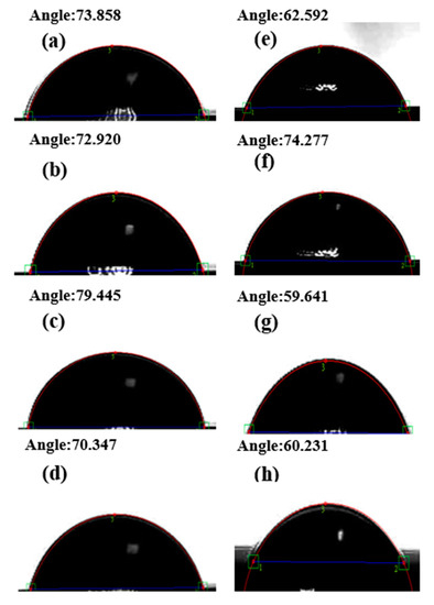 Figure 8a–d showed the contact angles (θ) with DI water: 73.85°, 72.92°, 79.44°, and 70.34° for the 10, 20, 30, and 40 nm films, respectively. Figure 8e–h shows the contact angles (θ) with glycerol as 62.59°, 74.27°, 59.64°, and 60.23° for 10, 20, 30, and 40 nm films, respectively. The contact angle results from DI water and glycerin are shown in Figure 8. The CoFeVB films can be used as a seed or buffer layer, so the surface energy and adhesion are very important. The results show that the water drops of CoFeVB film are almost spherical. The contact angles of the Co40Fe40V10B10 film were less than 90°, which indicates that the film has a good wetting effect and is hydrophilic. When the surface free energy is high, the liquid absorption is large and the liquid absorption area is also large, which leads to the decrease in contact angle [24,25,42].