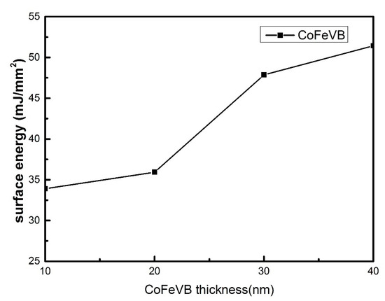 The surface energy of the Co40Fe40V10B10 films was obtained by measured contact angles, as shown in Figure 9 [24,25,26,27,28,29,32]. High surface energy corresponds to strong adhesion [43]. It was found that the surface energy tended to increase with the increase in thickness. Figure 9 shows that when the thickness increased from 10 nm to 40 nm, the surface energy range increased from 34.2 mJ/mm2 to 51.5 mJ/mm2, which indicates that the surface energy is larger and the adhesion is enhanced. The surface energy is the key factor affecting the adhesion of the film. As CoFeVB is compatible with MTJ applications, it can also be used as a free layer and in combination with other layers.