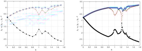 The Lyapunov exponents [27] are the commonly used metric to indicate periodic or (hyper)chaotic behavior. For the investigated system, the generalized Hénon map (1), the number of exponents is three, corresponding to the dimension of the state space. The algorithm computing the Lyapunov spectrum in [27] sorts the exponents from the largest to the lowest. When the system generates rapidly divergent trajectories, the largest exponent, , is positive, indicating random-like (chaotic) behavior. A positive value for the second Lyapunov exponent also is the mark of a hyperchaotic evolution, random-like dynamics in two directions of the space. The last exponent has to be negative to maintain the bounded space. Figure 3 shows the three Lyapunov exponents for a fixed value of the parameter b and varying a. Initial conditions, although irrelevant for this metric, , are the same as above.