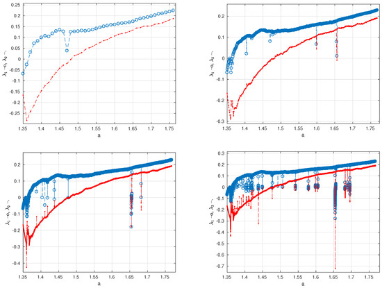 Lapunov exponents for and varying a in [0;2) using different computation steps. in blue, in red, in black.