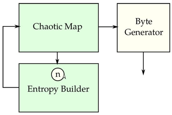 Each chaotic map (see Figure 5) has a number of parameters, , and a number of states . As an example, the 3D generalized Hénon has two parameters denoted by and three states denoted by . Every iteration, the entropy builder takes tuples of values (the current state values) and accumulates entropy. Every n iterations it also provides a tuple of values that replaces the current parameter set of the map. The entropy builder and the chaotic map have to match the same and to obtain a valid configuration. A general form for a three-dimensional map is given in (3).