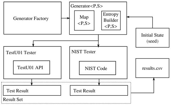 - test_suite—an application that takes as arguments the name of the map, the entropy builder, the number of iterations for time spacing and the initial state values and parameters and runs the TestU01 and NIST test batteries, outputting the results in a corresponding file, and appending a summary to the results.csv file;
