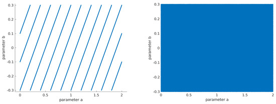 As already stated, the values for should be positive. When setting , the only interval for a where the pseudo-random behavior is enabled by the 3D generalized Hénon map is . The two coefficients are highlighted in Figure 4. Different values for the step used to compute their values (top left: , top right: , bottom left: , bottom right: ) reveal more and more undesired values for the pair —as the step is smaller. Those pairs are the ones for which . The fact that there are no continuous intervals of values for either a or b for which the map is chaotic or hyper-chaotic makes it difficult to choose or to validate values for the parameters and the initial states such that the generator does not enter a periodic loop. Since these five values represent the seed of the generator, it is crucial that their choice is appropriate. In [32] the solutions presented were either to define a system that will transform an invalid seed into a correct one during the system’s initialization, or to periodically alter the system’s trajectory during runtime, in order to avoid stable orbits.