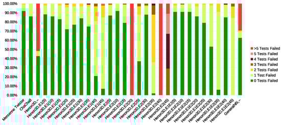 The third experiment complements the second in order to generate a statistic regarding the percentage of suitable seeds in the entire seed space. Obviously, an exhaustive approach is out of the question since the seed space, which is determined by all combinations of possible values for is approximately 314 bits if computation is done in 64-bit floating point precision. Some bits are lost because valid values for all numbers in the tuple are in a small interval around 0, as stated already in [16]. Therefore, a script was developed to run the testbench for 100 seeds considering all combinations of maps and entropy builders. The parameters of the map were changed by the entropy builder at each n iterations, with .