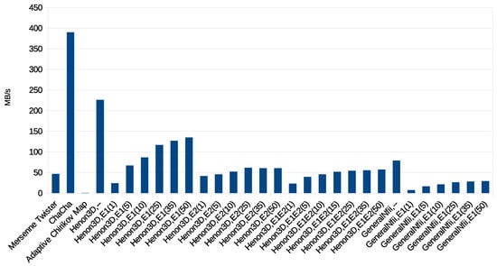 Analyzing several of the proposed configurations, it can be seen that the performance of the generator depends strongly on the selected entropy builder and the parameter change interval. However, compared to the non-CSPRNG Mersenne Twister, there is a significant performance improvement when using as an entropy builder. The best performance is given, as expected, by the generalized Hénon Map without any entropy builder, but that configuration has a low percentage of tests passed (≈50%). A good trade-off between tests passed and speed is the Hénon3D with the builder and 35 iterations between parameter changes. It provides an almost increase of performance over the Mersenne Twister with only a decrease in percentage of seeds with no test fails. A safer approach would be to use either with a change interval of 10 or with a change interval of 15, which pass the same amount of tests as Mersenne Twister but with about 30% increase in throughput. Compared to AVX-accelerated ChaCha8, the performance needs to be improved. This is an important target for future work and might be achieved by using several chaotic maps in parallel.