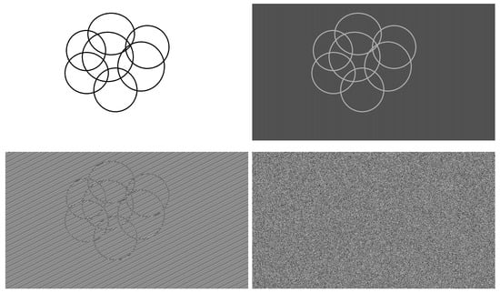 An image characterized by a very low entropy was used to highlight the effect of the enciphering process in Figure 11. From the left to right and top to bottom, there are shown: the plain-image, the encryption with , enciphering with , and the bottom right image is the result of successful encryption when using , using , respectively and . The visual effects are the same as for the high level entropy plain-image in Figure 10, but the entropy computed in Table 4 is more conclusive since it shows the differences between original and cipher more clearly.