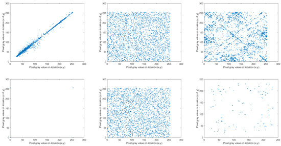 Further, we analyzed the correlation between adjacent pixels of the encrypted images compared to those of the plain-image. Scatter diagrams for adjacent pixels were plotted for the high entropy level plain-image in Figure 10 (top) and for the low entropy-level image in Figure 11 (bottom). Results are given in Figure 13. The top left up corner depicts the almost perfect correlation existent in the original high entropy image, while the down left corner shows the two gray levels in the low entropy chosen image. The middle correlations reflect the uniform distribution of pixel values when enciphering using the random-like behavior enabling parameters or the entropy builder, as well as and . The right up corner demonstrates a pattern in the scatter plot, when using , indicating dependence in the values of enciphered pixels. The right bottom corner (update with ) also shows unsatisfactory results, because the two gray-levels existing in the original low entropy level image were maped to only a few different intensity levels.