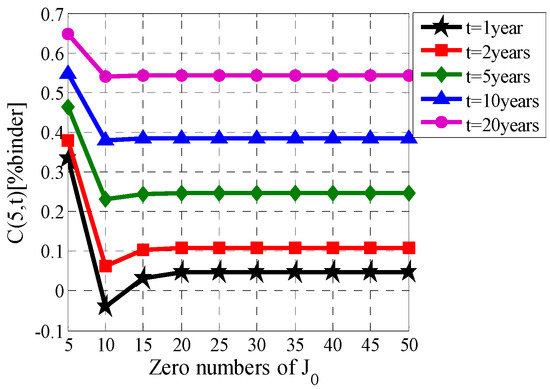 Effects of zero numbers of zero-order Bessel functions on the accuracy of the circular diffusion model are firstly discussed. The RC circular column with a radius of 50 cm in atmospheric zone is taken as an example, and the w/c for Portland cement type of that is 0.5. According to Equation (12), the mean value of D28 is 4.35 cm2/a. The mean values of C0 and m selected from Table 1 are 2% of the weight of the binder and 0.53, respectively. The diffusion depth is set at 5 cm. The final analysis result is presented in Figure 1. Figure 1 clearly indicates that the estimation results of the circular diffusion model keep stable when zero numbers exceed 20.