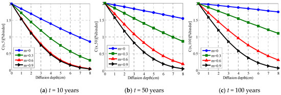 The model parameters, including D28 and C0, stay the same as in Section 2.3 with a series of assumed m of 0, 0.3, 0.6, and 0.9. For a given diffusion time, the chloride distribution and the diffusion depth under different m values are exhibited in Figure 3. In particular, the diffusion coefficient attains a constant value over time for m = 0. Clearly, in Figure 3 the distribution of chloride concentration is significantly overestimated at m of 0. The larger diffusion time and smaller age factor the more evident that is. Consequently, it will lead to an underestimation of the service life of the RC column. The higher the m, the faster the diffusion coefficient degrades simultaneously. This explains the lower concentrations at the same diffusion depth for higher m.