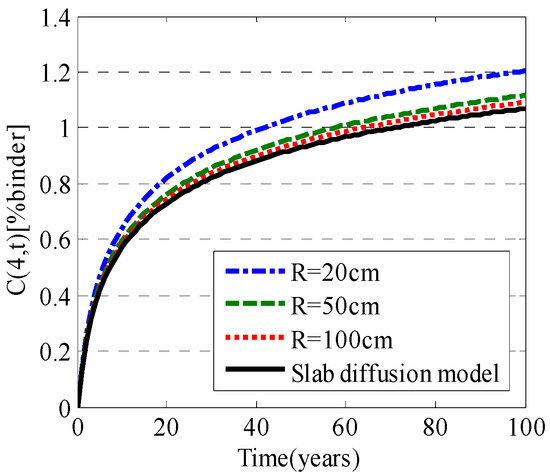 The sound and reliable estimation of chloride ion concentration on the surface of steel bars is significant. Here, this concentration, labeled C, is compared for estimates from the slab diffusion and the circular diffusion model. The 28-day diffusion coefficient D28 is set at 4.35 cm2/a, with an age factor m of 0.53, and the surface chloride concentration C0 is assumed at 2% of the binder weight. The effect of the shape on the chloride concentration on the surface of rebar during diffusion process is analyzed, as shown in Figure 4 and Figure 5. Figure 4 and Figure 5 highlight that for an RC circular section, the slab diffusion model underestimates the chloride concentration. As the radius increasing, the difference between the circular diffusion and slab diffusion models deceases gradually, implying that the effect of the circular cross-section diminishes slowly.