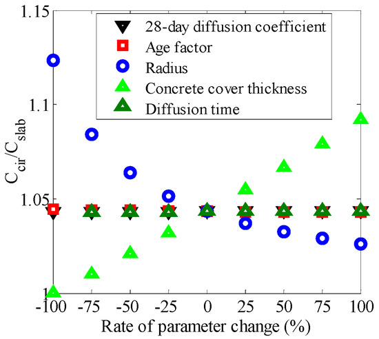 For an RC circuar column, Ccir/Cslab is introduced to measure the error on the work of using the slab diffusion model. The impact of the model parameters on Ccir/Cslab is disscused according to the sensitivity analysis methodology. Diffusion time, radius of the RC circualr column, and concrete cover thickness are labeled as t, R, and x, respectively. Obvioulsy, according to Equations (11) and (12), it can be found that Ccir/Cslab has no relation with C0. The change interval of other model parameters are listed in Table 2. During this analysis, one model parameter varies, with the others kept fixed. The final result is presented in Figure 6. It can be seen in Figure 6 that both higher x and smaller R will lead to the increase in Ccir/Cslab. Nevertheless, m, D28, and t have a very slight influence on this value. Distinctly, both R and x are more sensitivitive to Ccir/Cslab than the other model parameters.