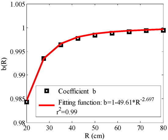 Considering a series of R, the values of k and b corresponding to each R are obtained by adopting the same regression fitting analysis with Figure 7. The final results are presented in Figure 8 and Figure 9. In Figure 8 and Figure 9, the specific forms of k(R) and b(R) are expressed after the regression fitting analysis again. Figure 8 shows that the coefficent b varies slightly with R and is simplified as a constant value of 1. Thus, the final form of Equation (13) for calculating Ccir/Cslab is expressed as follows: