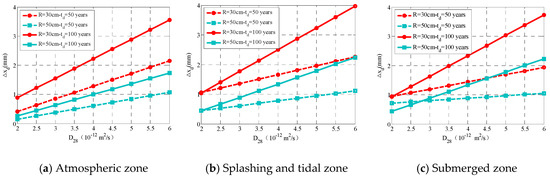 Given the design value of the chloride diffusion coefficient D28, the βd is satisfied by adjusting the minimum concrete cover thickness xd. The preliminary durability design result of xd corresponding to a series of D28 is shown in Figure 13. Clearly, for the RC circular column, the value of the minimum cover thickness designed by the original slab diffusion model is lower than that designed by the modified slab one. The Δxd is labeled as the difference between the design values of the minimum cover concrete thickness. Based on Figure 13, the Δxd as a function of D28 is displayed in Figure 14, with an evident linear relationship. Meanwhile, the reduction of the radius also increases the Δxd. For an expected lifetime of 50 years, the maximum value of Δxd is 2 mm when the radius is 30 cm. This value increases to 4 mm when the lifetime is 100 years. These data illustrate that the RC circular column shape minimally affects the design results. As a conservative choice, the minimum concrete cover thickness increases by 5 mm based on the design result of the original slab diffusion model.