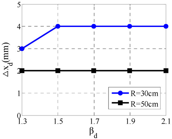 The circular RC column for the atmospheric zone assumes a td of 100 years, with a fixed 28-day diffusion coefficient of 6 × 10−12 m2/a, and the relationship between Δxd and βd is shown in Figure 15. Obviously, the effect of βd on Δxd can be overlooked.