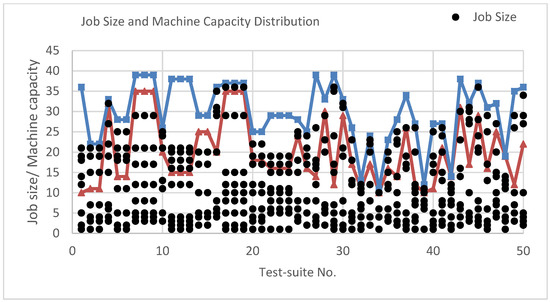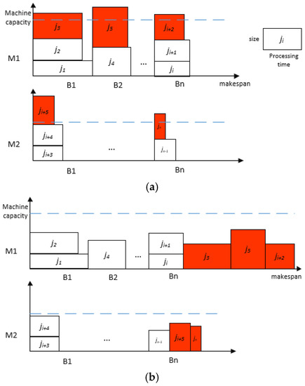 In , each machine can process up to three median batches or one long batch and one median batch. On the other hand, the SCMF-LPTJF program will allocate a long batch on the machine as much as possible. After it assigns a long batch on a machine, this machine still has enough time (at least time) to handle at least two median batches. Note that the SCMF-LPTJF procedure forms batches greedily. (It overfills each batch with the longest currently unassigned jobs.) Therefore, the SCMF-LPTJF procedure allocates more processing times for long jobs and median jobs on the machines with smaller capacities than does. Equivalently, we claim that is the lower limit of the overall processing time in a long working state, and the median job arranged on machines in , . Hence, if , then all long and median jobs will be allocated by SCMF-LPTJF.