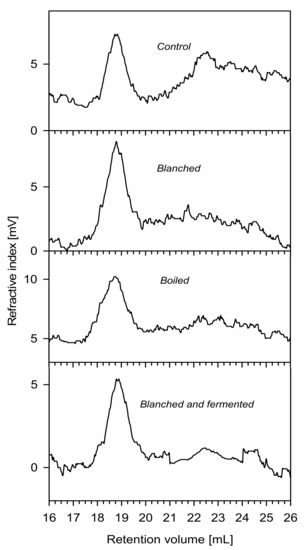 In order to establish molecular weight of the extracted polysaccharides, size exclusion chromatography was used (Figure 2). All the tested WSP gave intense signals at ~18.8 mL. These sharp peaks correspond to molecules of 216.3 kDa. This finding was also reported by Chen et al. [53] who isolated proteoglycan from L. edodes, having the molecular weight of 220 kDa and capable of scavenging free radicals. It is also consistent with the previous research in which 200 kDa polysaccharide (showing immunomodulating activities) was obtained from L. edodes water extract [54]. However, this study was unable to demonstrate the presence of larger molecules exceeding 600 kDa as was earlier reported by other authors [55,56]. Chromatogram of the control sample also contains the peak at 22.6 mL. It can be attributed to the smaller compound having the molecular weight of 11 kDa. This peak is removed due to the processing and a possible explanation for this might be that this compound was solubilized and extracted during blanching or boiling.
