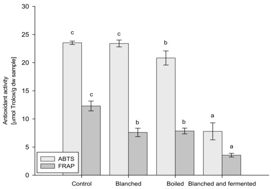 Mushrooms are rich in low molecular weight antioxidants, mainly phenolic acids. Such compounds are mainly present in free form and can be easily extracted with both water and organic solvents. However, some antioxidants bind to larger molecules and become less or non-extractable [57]. These compounds are often bound to mushroom derived polysaccharides and affect their antioxidant capacities. All the isolated WSP exhibited antioxidant activity in both assays (Figure 3). The highest antioxidant parameters were noticed in the case of the control samples (23.53 ± 0.30 µmoles of TE/g dw for ABTS and 12.29 ± 0.87 µmoles of TE/g dw for FRAP). Antioxidant activity of L. edodes polysaccharides was reported before and this study confirms earlier findings [16,35,58]. Blanching caused a significant drop in FRAP test (7.59 ± 0.75 µmoles of TE/g dw), while no relevant change in ABTS parameter was noticed. Boiling resulted in the decrease of ABTS activity (20.83 ± 1.24 µmoles of TE/g dw), whereas no further change in the case of FRAP test was observed. The most profound changes caused blanching and fermenting (7.78 ± 1.50 µmoles of TE/g dw for ABTS and 3.56 ± 0.33 µmoles of TE/g dw for FRAP). The results clearly showed that aqua-thermal processing may have negative impact on antioxidant parameters of polysaccharides. Previous findings showed that antioxidant activity of polysaccharides is related to total phenolics and protein content [59,60,61]. In this study, a high correlation was observed between ABTS values and total phenolics (R = 0.93) as well as protein content (R = 0.85). In the case of the FRAP parameter, the correlation coefficients were similar to ABTS (R = 0.96 and R = 0.82, respectively). Therefore, the reason for the drop in antioxidant capacity is very likely caused by the removal of phenolics and protein. Further studies should be carried out to isolate and identify antioxidant compounds which are bound to polysaccharidic matrix by covalent bonds [57].