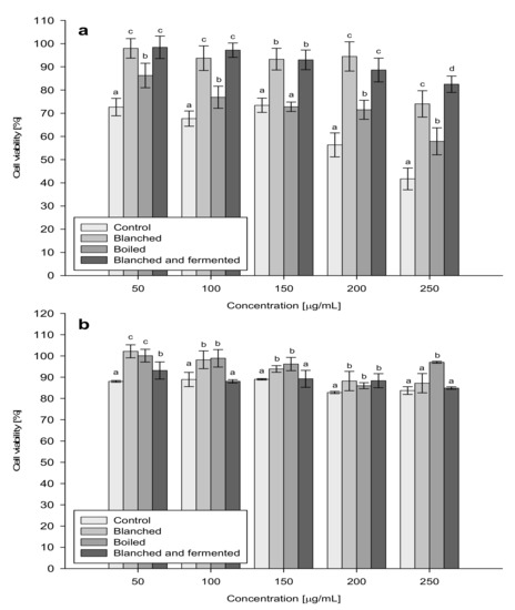 In the cell line T47D (Figure 4b), we have assessed no significant sensitivity to polysaccharides fractions from processed and control (Lentinus edodes fruiting bodies) mushrooms. Viability of T47D cells treated with maximal WSP concentration was consecutively 87.2 ± 4.5% for blanched, 84.9 ± 0.6% for blanched with further fermentation and 83.7 ± 1.8% for control sample. Interestingly boiling in water have led to complete loss of WSP antiproliferative activity (cells viability was 97.0 ± 0.5%).