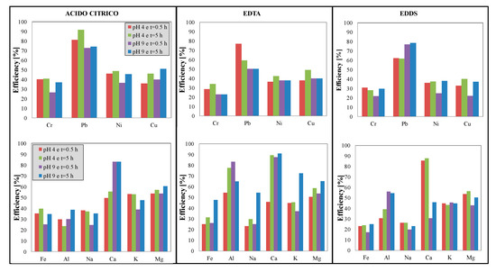 - deionized water, to study metal mobility. The comparison between the different selected chelating agents (Figure 2) shows that the most performing chelating agent, in terms of removal efficiency, is the citric acid. As far as the influence of concentration, it varies according to the chelating agent and the species to be complexed. In general, comparing the performances according to the concentration of the best agent (which is somehow very economical), it can be seen, already, that, at 0.05 M, the efficiencies are more than satisfactory, also on the basis of the reduction in the use of additives.