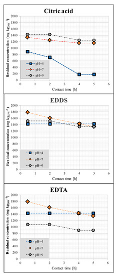 It should be noted that the best results were obtained with citric acid at pH 4 and contact time of 4 h: in general, the basic environment favors the dissolution of the pollutants only with EDDS and EDTA; on the other hand, citric acid seems little influenced by the alkaline environment, indeed favored by the further lowering of pH.