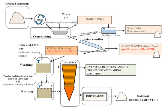 The studies reported in the literature demonstrate the high potential of the washing techniques, which have often been used satisfactorily for the treatment of contaminated land mainly with heavy metals and hydrocarbons. In particular, the treatment of sediment washing allows one to extract the contaminants from the sediment particles and then remove the soluble pollutants. For this purpose, a wide range of chelating agents can be used, such as ionic and non-ionic surfactants, organic and inorganic acids, but also sodium hydroxide and methanol. The inorganic acids include sulfuric acid (H2SO4) and nitric acid (HNO3) [6], while the organic acids include citric acid (C6H8O7) [7,8] and tartaric acid (C4H6O6) [9].