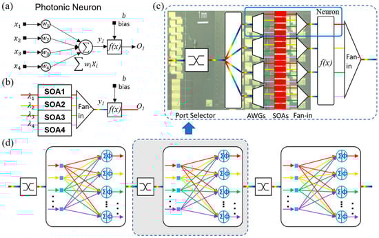 Photonic deep neural network based on the broadcast-and-weight architecture. (a) The artificial neuron model. (b) The implementation via arrays of semiconductor optical amplifiers (SOAs). (c) One full layer of neurons by exploiting one wavelength division multiplexing (WDM) input, with a shaded photonic integrated circuit micrography at the back, to underline that part of the circuitry that is realized on chip. (d) Scheme of a three-layer photonic deep neural network. The included port selector may be used to select the desired input source.