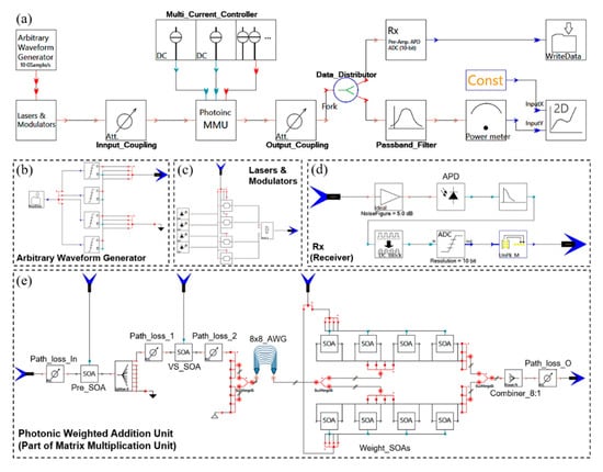 Photonic deep neural network (PDNN) simulation scheme on software VPIphotonics. (a) System for examining the PDNN. (b) Arbitrary waveform generator. (c) Lasers and modulators. (d) Receiver. (e) One photonic weighted addition unit (part of the matrix multiplication unit, MMU).
