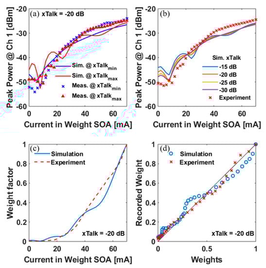 The crosstalk in the AWG in the photonic MMU (see Figure 2e) is set at −20 dB, as experimentally measured in []. Firstly, when all the weight-SOAs are set to OFF (XTalkmin), but one of these weight-SOAs is injected with currents from 0 mA to 70 mA, we record the signal peak power at channel 1, 193.1 THz, from the monitoring power meter as shown in Figure 2a. Then, we also record the signal power when all the weight-SOAs are set to ON (XTalkmax), and one of these weight-SOAs is injected with currents from 0 mA to 70 mA. The blue and red solid lines in Figure 3a plot the simulated result in the condition of XTalkmin and XTalkmax, respectively. For comparison, we also superimpose the measured curves in both cases: the blue crosses curve represents the experiment points with all SOAs ON, and the red triangles curve plots the experimental results with all SOAs OFF.