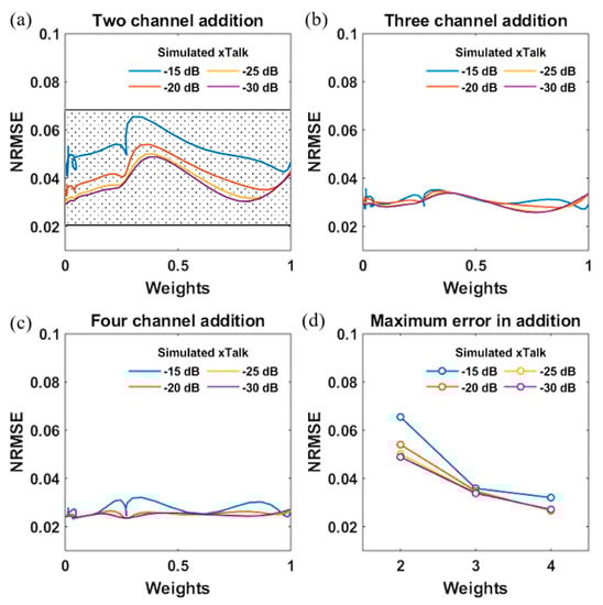 The weighted addition corresponds to the linear operation part in a neuron. The performance of the weighted addition is of importance for the signal processing in a neural network. To estimate the impairments induced by the weighted addition, we calculate the normalized root mean square error (NRMSE), i.e., the discrepancy between the measured data and the expected data. We use the calibrated weight control curve to set the weight factors for different input channels, and calculate the NRMSE while tuning the weight factor from 0 to 1. Figure 4a plots the results of two-channel weighted addition, where channel 2 is fixed to the weight ‘1’, while the weight for channel 1 is tuned over the overall range from 0 to 1. We also change the optical crosstalk in the chip to see the impact of the optical crosstalk on the weighted addition. The blue, red, yellow and violet lines show the error changes when the crosstalk is set at −15 dB, −20 dB, −25 dB and −30 dB, respectively. The shaded area shows the error range obtained from the experiments for two-channel addition. The error variation is attributed to the calibration of the weight control, as already anticipated in the weight factor curve in Figure 3c. The error related to the weighted addition operation increases when the induced optical crosstalk is greater, as a high level of crosstalk eventually results in a lower dynamic range. The same high crosstalk level enhances the peak power oscillation recorded for generating the weight control curve, resulting in severe error variations, as already anticipated in Figure 3d. Nevertheless, this fits perfectly within the error variation window we found for our experimental results (see the dashed box in Figure 4a). The same analysis is done while changing the number of channels added to the WDM input. Figure 4b,c plot the resulting errors for three- and four-channel weighted additions, respectively. A visibly smaller error is presented for three-channel and four-channel weighted additions. The effect of the optical crosstalk is reduced as the oscillation power caused by the optical crosstalk is relatively smaller with respect to the dominating signal power coming from the addition of all the input multiple signals. This suggests that the higher the number of inputs into the neuron, the better the accuracy when operating within the available power budget. Finally, Figure 4d summarizes the obtained results, by plotting the maximum errors versus the number of channels in weighted addition.