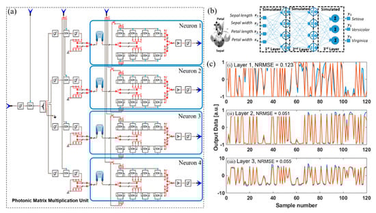 To investigate the performance of a complete neural network based on the combination of the AWG and SOA technology, for a broadcast-and-weight architecture, we implement and simulate an image classification problem, namely the iris flower classification problem, which has been reported to be able to be solved by using a deep neural network (DNN). The iris database includes three classes (Setosa, Versicolor, and Virginica) of 50 instances each []. Per each instance, the iris flower category is identified by observing four of its attributes: length and width of its sepals and petals. For this demonstration, we have executed the training of this DNN via the simulation platform Tensorflow [], where we have used 120 instances as a training database. In order to make use of 4 weighted addition circuitries already available on chip and per layer, a feed-forward network made of 2 hidden layers with 4 neurons each and an output layer with 3 neurons (see Figure 5b), is trained on a computer. The attributes are encoded into 26 optical power levels at the photonic MMU input. The trained weight matrix is mapped to the matrix multiplication on the photonic components. The simulated structure of one layer of neurons is shown in Figure 5a, which is used to replace the photonic matrix multiplication unit in Figure 2e. The same chip is indeed capable of eight channel inputs, but we used four inputs for this classification problem. A total of 16 weight-SOAs in this matrix multiplication unit are used to assign the trained weight matrix from the trained DNN model to the PDNN. The hyperbolic tangent activation function is implemented offline after the O/E conversion. The output from the first hidden layer serves as input to the second layer (via the arbitrary waveform generator) and the output from the second hidden layer serves as input to the third (output) layer. Finally, the output of the third layer, after the SoftMax transfer function, , provides the predicted probability of the output samples y of belonging to class j. Figure 5c presents the output data at the output (i) of the 1st neuron in the 1st layer, (ii) of the 2nd layer and (iii) of the 3rd layer, with the blue line being the simulation results and red line the expectations and resulting in errors of 0.123, 0.051 and 0.055 respectively. These errors represent the performance of layers of photonic neurons. Higher error at the first layer may be due to the high optical signal noise ratio (OSNR) required multilevel encoding of the input signal, while a better performance at the 2nd and 3rd layer is attributed to the filtering of the signal level into lower levels after the first hidden layer. Also, the output of the first layer appears to be the most important for this classification problem, and therefore the utilization of three layers is slightly overstated.