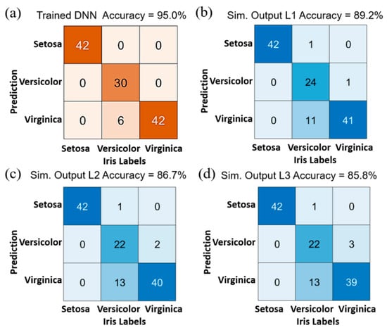 The correlation matrix between the prediction and the labels of the samples is used to show the final accuracy obtained via the multilayer photonic neural network (see Figure 6). We consider three cases for the sake of understanding the influence of the photonic layer implementation. In Figure 6a we display the prediction accuracy as coming from the trained DNN on a PC. This is calculated to be 95% since 6 out of 120 iris flower instances are falsely predicted. We simulate the DNN after adding, time by time, the photonic deep neuron network layers. The prediction accuracy decreases as the number of layers of the photonic neural network increases. The accuracy changes from 89.7% when the 1st layer is substituted with a photonic layer (Figure 6b), down to 86.7% when both the 1st and the 2nd layers are substituted with photonic layers (Figure 6c), and down to 85.8% when all 3 layers of matrix multiplications are computed via three photonic layers (Figure 6d). This may be due to the error accumulation which causes prediction accuracy degradation. Furthermore, the simulation result aligns well with the experimental result trend as shown in Figure 7a.
