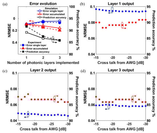 Figure 7a plots the error evolution with an increasing number of the photonic layers. The solid lines with open symbols represent the results from the simulation and the dashed lines with filled symbols represent the experimental results. The circles show the error induced by each single layer on the 3-layer network, where the errors keep staying almost at the same level, about 0.07 in the simulation and 0.08 in the experiment. The triangles plot the accumulated error from layer to layer, which increases from 0.1 to 0.18 for simulation and from 0.10 to 0.20 in the experiment. The squares represent the final prediction accuracy as we calculated from the correlation matrix, which decreases from 89.2% to 85.8% as shown in Figure 6 for simulation and from 91.2% to 85.8% for experiments []. The experimental results show great agreement with the simulations, which means that investigating the performance while changing some of the parameters involved in the photonic integrated circuit (PIC) will help to get some insight into the photonic chip architecture and scalability. From the perspective of the final prediction accuracy and error induced by the photonic neural network chip, the impact of the optical crosstalk from the AWG and the waveguide crossings are investigated. We tune the crosstalk from −15 dB to −30 dB with 1 dB steps and implement the 3-layer neural network after generating the weight calibration curves as reported in Section 4. Figure 7b plots the results at the output of layer 1, with the blue line representing the average NRMSE from 4 neurons at layer 1 and the red line plotting the variation of the final prediction. Similarly, Figure 7c,d illustrate the average NRMSE and the final prediction versus the optical crosstalk in the layers. The error induced by the chip is almost in the same range for different crosstalk values, though it slightly reduces when the crosstalk decreases. The prediction accuracy for Layer 1 in Figure 7b shows a stronger crosstalk dependency; a smaller optical crosstalk at Layer 1 provides a better prediction accuracy. This may be related to the fact that the first layer operates on high resolution multilevel input signals, which require a higher optical to signal ratio available. A better accuracy also appears when the crosstalk is high, i.e., near −15 dB. This might be attributed to the errors leading the prediction of the flower label to a different minima location, i.e., to changes of the state of the network, as will also be found in Section 5. Figure 7c shows a flattened accuracy for optical crosstalk smaller than −20 dB. Figure 7d shows an even more flattened accuracy level as the variation of the induced error is smaller. The accuracy level is maintained from the 2nd layer onwards.