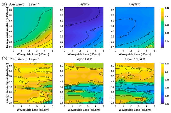 The performance of the PDNN is expected to be influenced also by the reference energy level used to operate the optical engine and by the loss on chip. Therefore, we study the performances of the PDNN by executing the iris classification problem, while tuning the reference power level of weight factor ‘1’ used in the integrated circuit, i.e., while tuning the current used in the SOAs, as well as while assuming different waveguide losses for the optical paths. This analysis is carried out to understand opportunities for energy savings and best chip physical layer characteristics, which still guarantee a high level of prediction accuracy. In particular, for this analysis, we consider only the waveguide loss as the main loss component as this is true for large size PIC. Therefore, we calculate the NRMSE at the output of each photonic neuron layer, as well as the prediction accuracy obtained when involving this layer in the 3-layer DNN for the iris flower classification, and we provide 3D color maps of error and accuracy as a function of the scanning waveguide losses and energy consumption on different reference power levels. Figure 8a illustrates the average errors obtained at the output of the 1st layer, the 2nd layer and the 3rd layer as a function of the waveguide loss and the energy consumption. It can be observed that fewer losses allow less energy consumption, for the same error level. This suggests that by only improving the waveguide loss on chip we can double the energy savings. The induced error from the photonic DNN is expected to be greater when the waveguide losses are higher and the energy consumption per operation at the matrix multiplication unit is lower, as the dynamic range is not enough to be able to distinguish multilevel data. On the contrary, smaller error values are observed with lower waveguide loss and higher energy used for the weighted addition operations (see moving from lighter color to darker color, from bottom right to top left side in Figure 8a and for each layer). For Layer 1 this is more evident and is coherent with our previous conclusions. It is not surprising that we need to either tune the reference power to higher levels or reduce the waveguide loss to obtain smaller errors at the neuron signal processing.