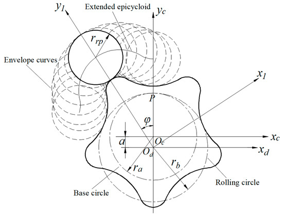 Theoretically, when the standard cycloidal gear meshes with standard pinwheels without any clearance, the number of simultaneous meshing teeth of the cycloidal gear is half of the number of pinwheels. Due to manufacturing errors, assembly errors, and requirements of lubrication of the cycloidal gear transmission, there must be clearances that are initial clearances between the cycloidal gear and pinwheels. Tooth profiles of the cycloidal gear should be modified to improve its contact performance. According to the theory of gearing, the combined use of isometric and shifting tooth profile modification is a general modification method of cycloidal gears. Coordinate systems of the cycloidal gear and pinwheel are shown in Figure 2. A coordinate system Oc-xcyc is fixed to the center of the base circle of the cycloidal gear. A coordinate system Od-xdyc is fixed to the center of the rolling circle of the cycloidal gear. A coordinate system Od-x1y1 is fixed to the center of the rolling circle of the cycloidal gear, and the y1-axis passes through the center of the pinwheel. Coordinates of the tooth profile of the cycloidal gear can be represented as