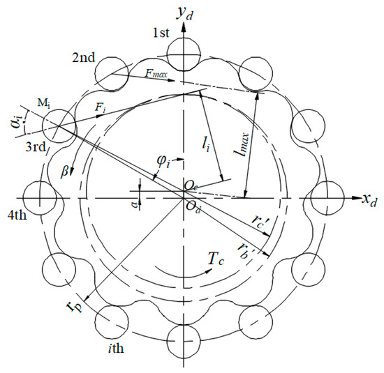 The position of the maximum contact force of the pinwheel is at the point with the maximum arm of force . By excluding small nonlinear deviation caused by the equivalent curvature, the contact force acting on the -th pinwheel is