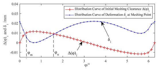 The contact force and deformation of the modified RV speed reducer prototype and those of the initial RV speed reducer prototype are calculated based on the tooth contact analysis method for cycloidal gear transmissions. The maximum contact force and normal deformation of the modified RV speed reducer prototype can be obtained after 17 iterations, as shown in Table 7 and Table 8, respectively. To transfer the same torque , the maximum contact force between a cycloidal gear and a pinwheel of the modified RV speed reducer prototype is 1435.9 N. After TE compensation, the maximum contact force of the RV speed reducer prototype is reduced by 24.83%. The maximum normal deformation of the cycloidal gear after modification is 0.0088 mm. After TE compensation, the maximum normal deformation of cycloidal gear of the RV speed reducer is reduced by 24%. The initial clearance and contact deformation of the modified RV speed reducer prototype are shown in Figure 10. After TE compensation, the number of meshing teeth of the cycloidal gear increases from 9 to 17.