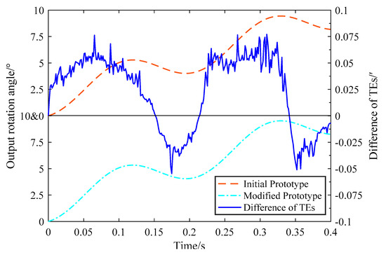 After TE compensation, the TE of the modified RV speed reducer is simulated by using Adams. The simulated input shaft rotation angle of the modified RV speed reducer prototype model after running 0.4 s is 826.2996°. The simulated output shaft rotation angle of the modified RV speed reducer prototype model after running 0.4 s is 8.2429°. The TE of the modified RV speed reducer prototype model has accumulated twice and its value for a period is 0.8538’. TE simulation results of output shaft rotation angles of the initial and modified RV speed reducer prototype models are shown in Figure 9. By comparing the TE of the modified RV speed reducer prototype model with that of the initial RV speed reducer prototype model, the TE of the modified RV speed reducer prototype model is reduced by 41.35%.