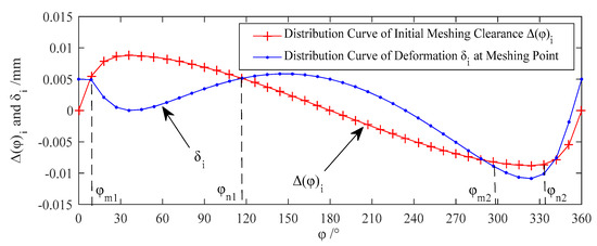 Since initial clearances are different after modification of the cycloidal gear, the relationship between and is nonlinear. However, since changes in and are small, the relationship between and is assumed to be linear. Based on the above analysis, pinwheels in the simultaneous meshing state are classified as pinwheels from the -th to the -th pinwheel. The contact force of the -th pinwheel is