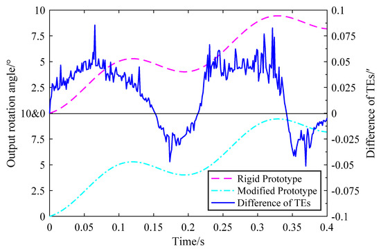 In order to verify the feasibility and accuracy of the proposed elastic TE compensation method, the TE of the RV speed reducer is simulated by using Adams, as shown in Figure 8. The input angular velocity of the RV speed reducer is set as a sine function , where A is 4615, B is 30, and C is 2005. The function completes one cycle at a time, the input shaft completes one rotation with a change of the rotation direction, and the TE completes one accumulation. The mean of the TE is smoother, and the change of the rotation direction of the cycloidal gear is smoother. In Adams, cycloidal gears with normal deformation are set as flexible bodies, and the contact penetration value between a cycloidal gear and pinwheels is set as 10−3.