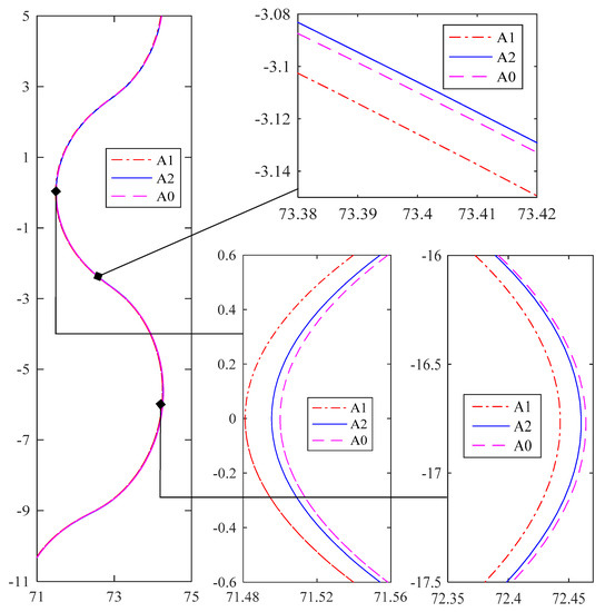 Cycloidal gear specimens a1 and a2 were manufactured by a gear grinding machine based on parameters of the initial and modified RV speed reducer models. Manufacturing errors of cycloidal gears are inevitable. Tooth profiles of cycloidal gear specimens a1 and a2 were measured by using a tooth profile meter. Measurement results with an amplification factor of cycloidal gear specimens a1 and a2 are shown in Figure 13. Curves A0, A1, and A2 are tooth profiles of the theoretical cycloidal gear a0 without any modification, the measurement result of the initial model profile of the cycloidal gear a1 with manufacturing errors, and the measurement result of the modified model profile the cycloidal gear a2 with manufacturing errors and modifications, respectively.