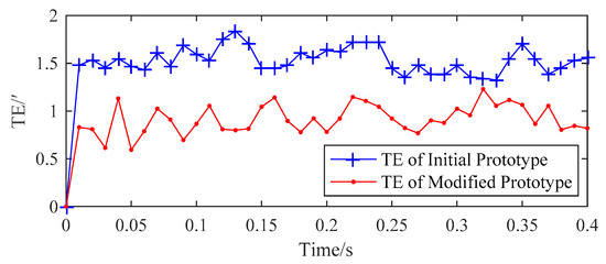 The TE of the modified RV speed reducer prototype model is obviously reduced. This is due to the decrease of normal deformation and the contact force caused by the increase of meshing gears. Therefore, it can be indicated that the proposed TE compensation method effectively improves the transmission accuracy of RV speed reducers.