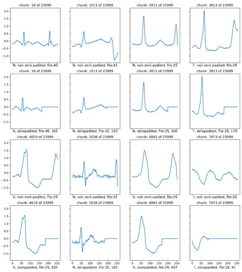 Samples of 16 chunks out of 23,999 beats training data. The 10th chunk, our top left chunk, contains the Normal beat taken from the 40th file. The first and third row were the original signals, while the second and fourth row were the zero-padded signals.