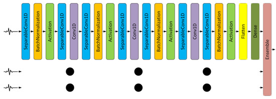 The depthwise separable CNN as described in Table 2 was used to improve the training time, while the ensemble of depthwise separable CNN, as depicted in Figure 5, was used to improve further its classification accuracy. The input layer size is 256 representing the raw ECG beat waveform, while the output layer size is 16 representing the number of classes as described in the MIT-BIH database (see Table 1). There is a group of layers repeated three times, i.e., layer 5 to 9, layer 10 to 14, and layer 15 to 19. These five layers contain three convolution layers with filter size of 5, 1, and 5, respectively. Layer 5 to 7 is configured according to the DSC algorithm. Moreover, layer 2, 7, 12, and 17 were using stride 4 to replace the function of pooling layer according to the ACN algorithm. Suppose that we use an ensemble of three DSC, the total number of parameters will be three times larger, i.e., 34,719 train parameters, which is still less than the train parameters without DSC, i.e., 47,600. As is discussed in Section 5, the use of ensemble improves its accuracy.