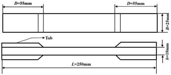 For this study, the GFRP materials which are widely used in the 1.5 MW wind turbine blade are chosen to fabricate the specimen. ECW600-1270 unidirectional glass fiber and 920W epoxy resin provided by Taishan Fiberglass Inc. (Taishan, China). were used to produce specimens. The fiber cloth used in the experiment was unidirectional prepreg glass cloth, and the ratio of epoxy resin was 42%. The laminates were hand-laid and the fiber layup angle was 0° [20]. The vacuum bag–autoclave process was used to cure the GFRP composite. The pressure of the vacuum bag is 0.06 MPa. The void fractions can be varied by applying different autoclave pressures [31]. In order to obtain different void fractions, specimens were prepared respectively under three different autoclave curing pressures of 0.1 MPa, 0.3 MPa and 0.4 MPa. According to the ASTM D3039 standard, the specimens were cut with a diamond cutting machine. Ten specimens were produced under each of the three curing pressures with the size of 250 mm × 25 mm × 10 mm. Then the cutting surfaces of the specimens were polished and the allowable parallelism error of the edges should be less than 0.25 mm. It is necessary to bond the bracing sheets at both ends of each specimen to prevent it from slipping off the test machine during the loading process, which may reduce the reliability of data. The material of the tab was a continuous E glass fiber-reinforced polymer with the length of 55 mm and the thickness of 2 mm. The schematic of the specimen is shown in Figure 2.