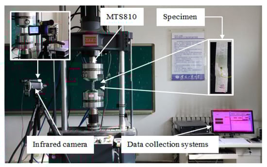 The specimens A, B and C were tested in a static tensile test and the pull–pull fatigue test under the condition of room temperature and air medium. An infrared camera NEC R300 was used to measure the surface temperature accurately. As shown in Figure 3, an electro-hydraulic servo universal fatigue testing machine MTS810 was used in these tests. The maximum static load was 333 kN, the maximum dynamic load was 250 kN and the frequency range was 0–30 Hz. The operating wavelength of NEC R300 thermal imaging camera was 8–12 μm, the measurement accuracy was ±0.1 °C and the frame frequency range was from 8.5 Hz to 60 Hz.
