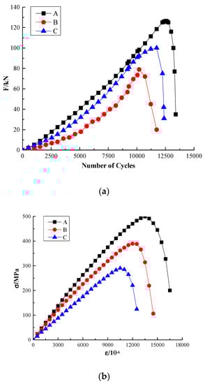 The load-number of cycles curve and stress–strain curve during the pull–pull fatigue test of the three groups A, B and C are shown in Figure 4.
