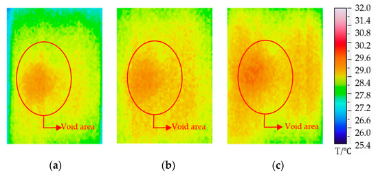 As shown in Figure 4a, during the loading process, the load-number of cycles curves of the three groups of specimens follow the same trend, that is, they all increase first and then decrease. Additionally, the larger the void fraction is, the lower the fatigue load value is, because the local stress concentration is generated in a field where the void defects are densely distributed, resulting in a decrease in the strength. The stress at this field quickly falls to the limit stress, which is the corresponding stress when each group of specimens is subjected to fracture or failure. The limit stress can be sustained by nearby fibers at best, and then damage is formed. Figure 4b illustrates the stress and strain of the three groups of specimens at any time during the fatigue loading. The value of the internal energy storage E can be calculated by substituting the stress and strain into Equation (16). However, there is no determination in previous studies of the critical moment at which the defect evolves into actual damage. The defect evolution causes the interior of the material to be irreversibly deformed, and the energy is released in the form of heat dissipation, which is reflected as the temperature change on the infrared thermograph. The surface temperature of the specimen is measured by an infrared camera and formation of actual damage is studied from the perspective of energy dissipation. Taking group C as an example, the infrared thermographs of the defect evolution process monitored in the specimen are shown in Figure 5, and the voids area is marked.