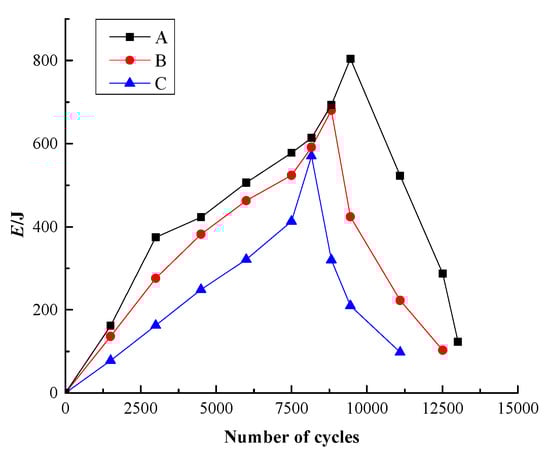 It can be seen from Figure 6 that when the internal energy storage in three groups A, B and C reaches peak, respectively, the number of cycles is 9450, 8820 and 8160. It can be assumed that these three moments are the critical moments of the actual damage of the specimens. Figure 5 shows that when the defect area would not evolve any longer, the corresponding numbers of cycles are 9501, 8784 and 8076. This shows that at the critical moment of the assumption, the defect area of the material is almost no longer evolved.